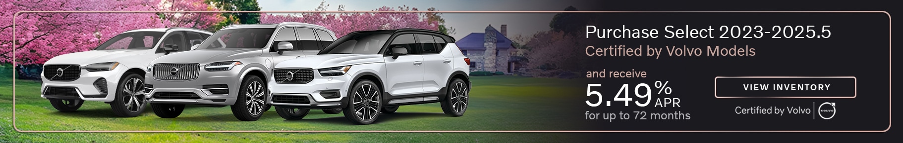 5.49% APR applies to select 2023–2025.5 Volvo Certified Pre-Owned vehicles. No down payment required. Offer available to qualified customers that meet Volvo Car Financial Services (VCFS) credit standards at authorized Volvo Cars Retailers. 5.49% APR financing up to 72 months at $16.33 per month per $1,000 financed. Other rates and terms are available. Actual down payment will vary with APR and credit qualifications. Not everyone will qualify for credit approval or advertised APR. Advertised financing does not include taxes, title, registration, and license fees, insurance, maintenance, and other retailer fees. All offers are subject to vehicle availability. Must take delivery of vehicle between April 1, 2026 and April 30, 2026. See your participating Volvo Cars Retailer for details.